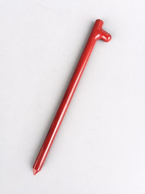 The 12″ inch military stake is forged from 4140 steel then heat treated to 40-48 Rockwell C hardness and coated with an industrial baked on red enamel paint. Note: Hardened steel tent pins are specified for use in frozen or very hard ground conditions.