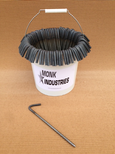 100 piece bucket of unpainted 5/16″ diameter x 10″ long tarp stakes